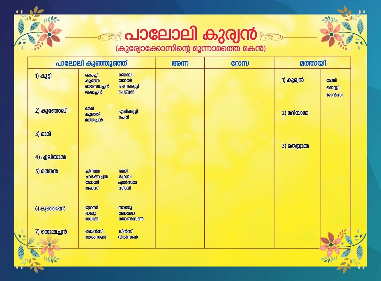 പാലോലികുര്യൻ: കുര്യാക്കോസ് ആദ്യ വിവാഹത്തിലെ മൂന്നാമത്തെ മകൻ. ഭാര്യ മറിയം കളത്തിക്കാട്ടിൽ കുടുംബാംഗം ആനിക്കാട് കുര്യൻ വിവാഹശേഷം മേവടക്കടുത്ത് പാലോലി എന്ന സ്ഥലത്തേയ്ക്ക് താമസം മാറി നമുക്ക് ലഭിക്കുന്ന വിവരങ്ങൾ അനുസരിച്ച് 1909-ൽ നിര്യാതനായി. കുര്യന്റെ മരണശേഷം മക്കളായ പാലോലികുഞ്ഞൂഞ്ഞ് 1930 - ൽ അറക്കുളത്തിനും , പാലോലി മത്തായി 37-ൽ എരുമേലിക്കും താമസം മാറി. കുര്യന്റെ വംശാവലി ഇന്ന് എരുമേലി, കാഞ്ഞാർ, മൂലമറ്റം, ആറക്കുളം, നെടുംകണ്ടം കോതമംഗലം, മണ്ണൂത്തി, കുട്ടനെല്ലൂർ, തിരുവനന്തപുരം എറണാകുളം, കാലിച്ചാനടുക്കം എന്നിവിടങ്ങളിലും വിവിധ വിദേശ രാജ്യങ്ങളിലും താമസിക്കുന്നു.